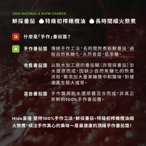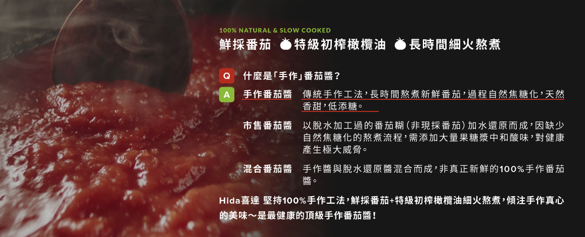 Hida喜達 即食鮮調番茄醬,堅持以新鮮蕃茄+天然食材+特級初榨橄欖油,長時間細火熬煮。 所有鮮採蕃茄的運送都分秒必爭,確保悉心熬煮過的鮮甜在「最適熟度番茄採收後的24小時內」完成真空充填,牢牢鎖住新鮮!!